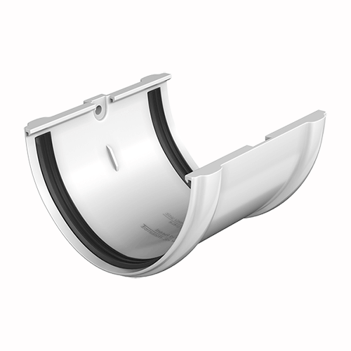 С помощью соединителя последовательно соединяют два водосточных желоба или желоб и угол. Резиновый уплотнитель делает это соединение герметичным.